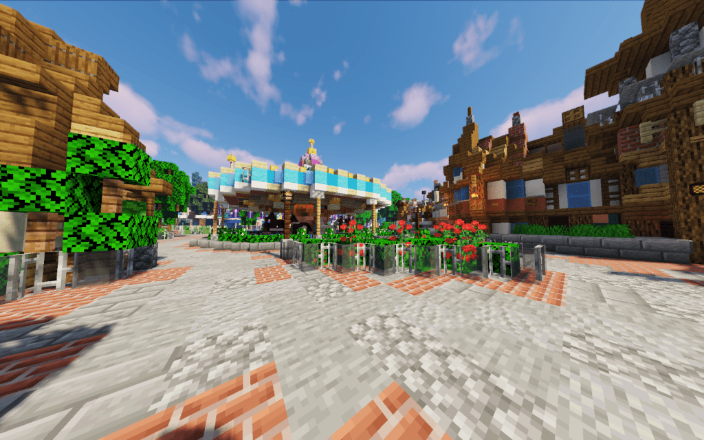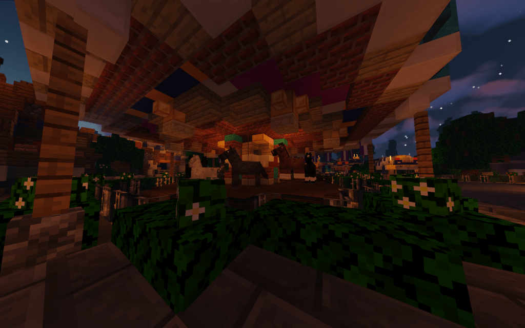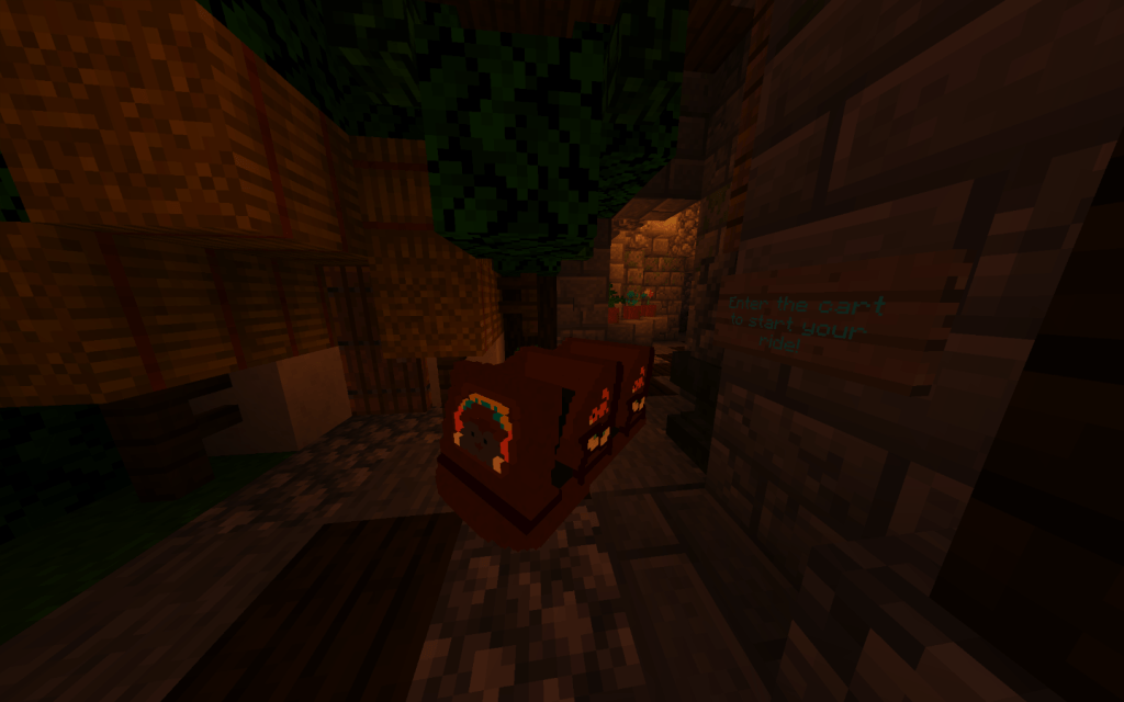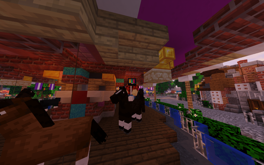 We first went on the King Authors Carousel. Unlike a few server which use 3D models as the horses, Magical Attractions uses the in-game horses to showcase the carousel horses. While it has less detail it feels more true to the game. The carousel moved very well and was a fun all yet filler ride that does look great in its area. A collage of photos of the ride will be below. From there I decided to go ride Snow White’s Scary Adventures.